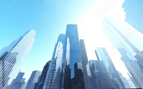 Skyscrapers against the sky, modern high-rise buildings, 3D rendering.