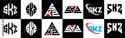 SKZ letter logo design in six style. SKZ polygon, circle, triangle, hexagon, flat and simple style with black and white color variation letter logo set in one artboard. SKZ minimalist and classic logo