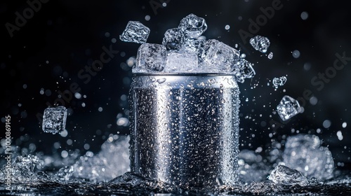 Sleek aluminum can with ice cubes and water splashes frozen in motion, isolated on a dark black background