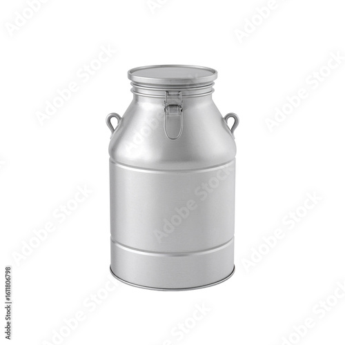 Sleek aluminum milk churn isolated, showcasing metallic sheen, ideal for product visualization,