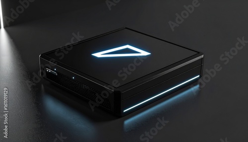 Sleek black console with a glowing “Z” logo on its screen, surrounded by dynamic LED lighting and soft ambient reflections on a matte desk