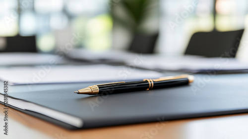 sleek black pen rests on leather folder, symbolizing professionalism and readiness for important tasks. blurred background suggests modern office environment