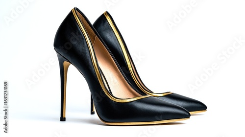 Sleek, black, pointed toe stilettos with gold trim on a white background