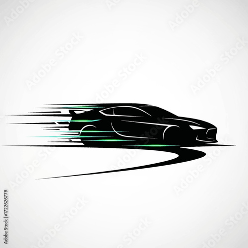Sleek black sports car silhouette with speed lines, depicting motion and velocity on a white background.