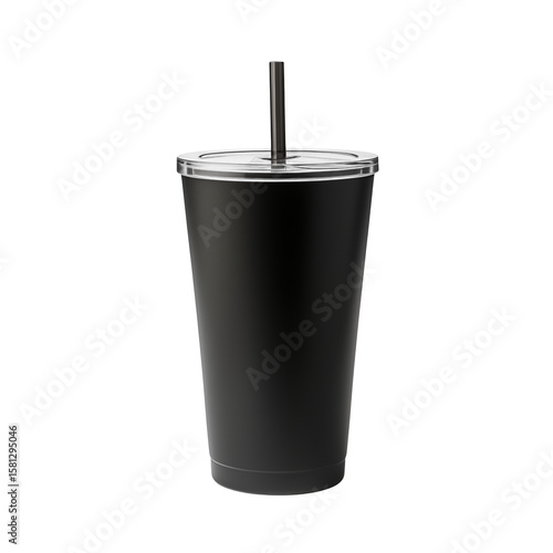 Sleek black tumbler with straw presents modern drinkware against a dark backdrop element isolated on transparent background.