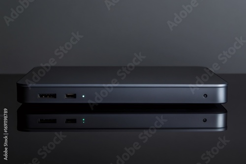 Sleek, dark gray dual band router sitting on a reflective surface, its LED indicators glowing softly, suggesting active data transmission