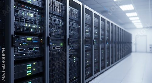 Sleek Data Center Interior with Rows of Servers and Glowing Lights in a Modern Facility