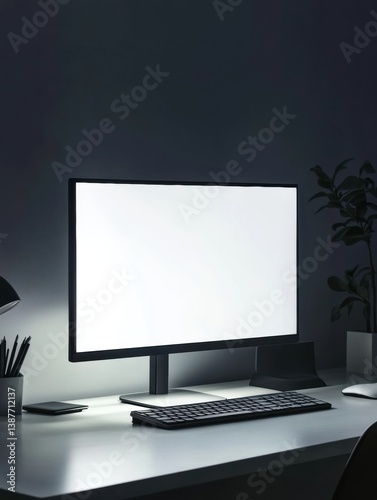 Sleek desktop monitor illuminating a modern workspace with minimalistic design and soft shadows at night