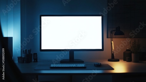 Sleek desktop monitor with bright white screen in minimalistic workspace at night