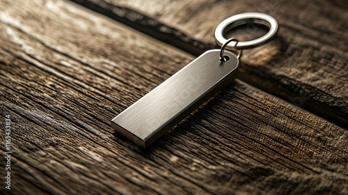Sleek engraved keychain mockup displayed on a simple wooden surface, perfect for branding and product promotion.
