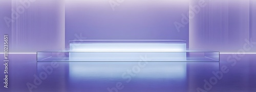 Sleek glass podium illuminated softly, with a pastel purple backdrop and plenty of space around it for product showcasing.