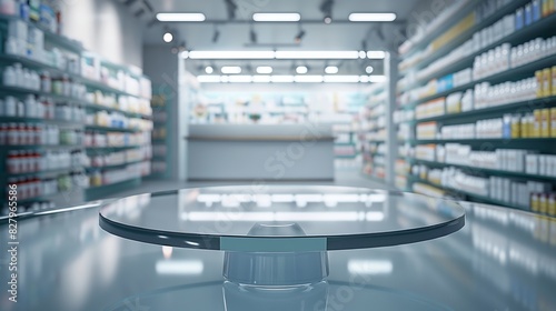 Sleek Glass Podium in Modern Well-Lit Pharmacy for Health and Wellness Products Commercial Photography