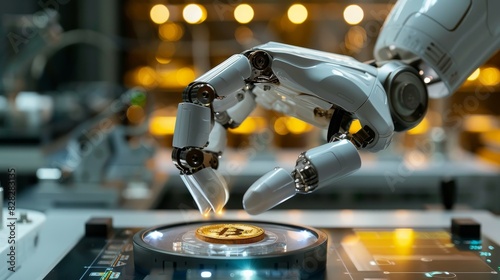 sleek humanoid robot arm carefully places a gold coin on a digital scale