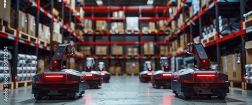 Sleek industrial robots automate packaging in a high-tech warehouse. Red and black robots efficiently move among organized shelves filled with products. A scene of modern logistics.