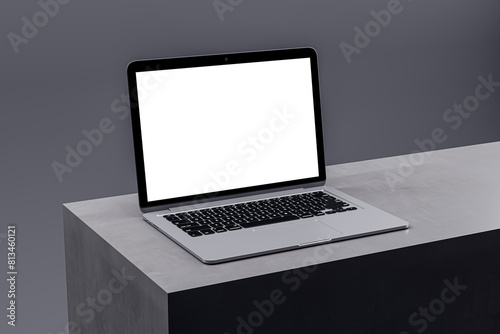 Sleek laptop on minimalist podium with a white screen ready for branding, ideal for tech showcases. 3D Render