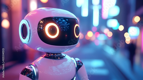 Sleek metallic 3D rendered robotic assistant with glowing eyes holographic digital interfaces and advanced futuristic technology