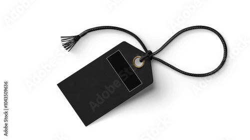 Sleek, minimalist black price tag with a string, displayed on a white background, ideal for themes related to retail, sales, pricing, and promotions in a clean, modern style