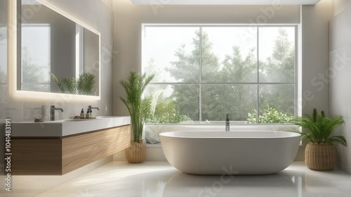 Sleek modern bathroom with large mirror and clean fixtures, no people, with space for text