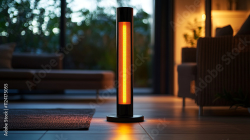 sleek modern electric heater stands upright on a clean, minimalist surface. Its compact design, metallic finish, and efficient form symbolize innovation, energy efficiency, and contemporary lifestyle