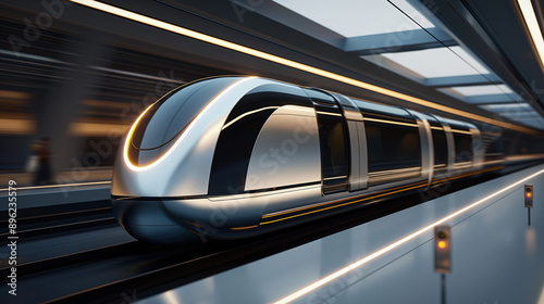 Sleek, modern high-speed train moving through a futuristic train station with reflective surfaces and advanced design.