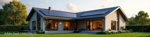 Sleek modern home, solar panels on gable roof, clean, eco-friendly