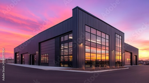 sleek, modern steel commercial garage building, featuring sharp angles and large glass windows reflecting a vibrant sunset, surrounded by an industrial landscape