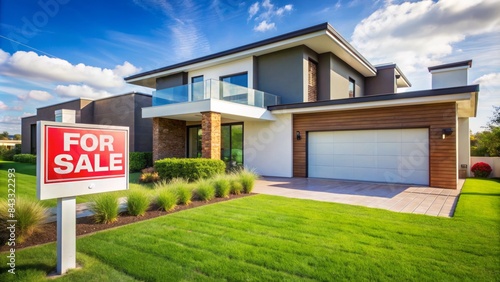 Sleek modern suburban home with immaculate lawn and elegant exterior, nestled behind a prominent for sale sign on a sunny day with soft focus background.