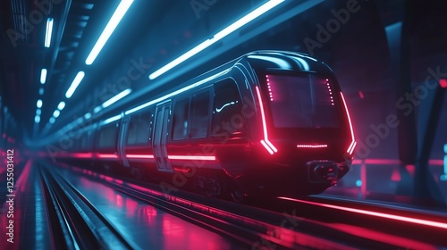 Sleek modern subway train illuminated with neon lights in a futuristic underground station. Urban transport and technology concept