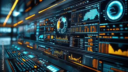 sleek modern workspace featuring vibrant computer interface with data visualizations and analytics