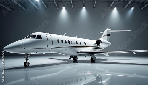 Sleek private jet in a spacious hangar, perfect for a high-end advertisement setting.