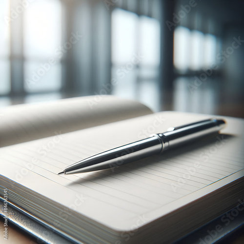Sleek silver pen on notebook in a minimalist office setting. Journal, Planning, Writing.