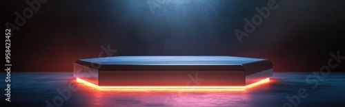 Sleek unadorned display stand illuminated with light and glow Hexagonal platform for design purposes Showcase pedestal Futuristic conceptual backdrop 3D rendering