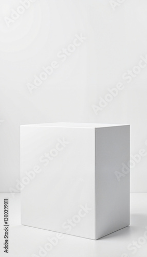 Sleek white cube packaging mockup on reflective surface, minimalist design