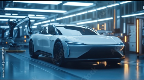 Sleek white electric car on automated assembly line in a futuristic, brightly lit factory. Robotic arms are visible in the background
