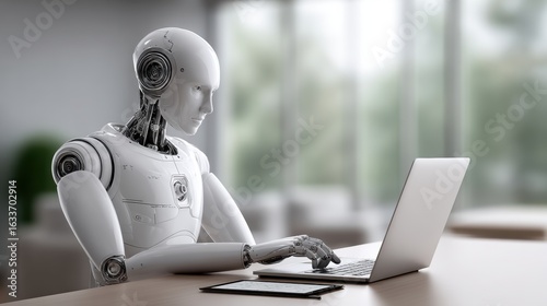 Sleek white humanoid robot sits at bright office desk, focused on typing on modern laptop, with digital tablet beside it. This powerful imagery symbolizes advanced artificial intelligence,
