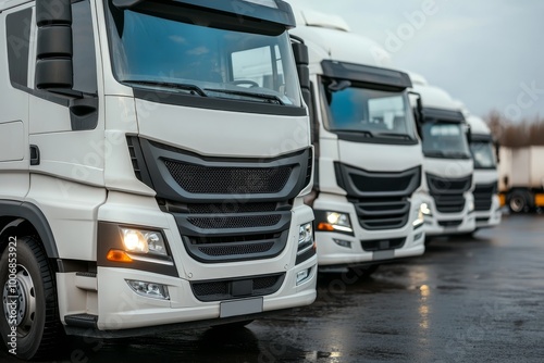 Sleek White Semi-Trailer Trucks in Parking Lot Close-Up Front View of Polished Vehicles in Tranquil Setting