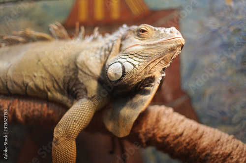 Sleepy iguana resting on a branch while in a terrarium, a reptile from Central America and southern Mexico.