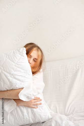 Sleepy teenage girl with eyes closed embracing white pillow in neutral white bedroom, teenagers sleep deficiency, good sleep concept