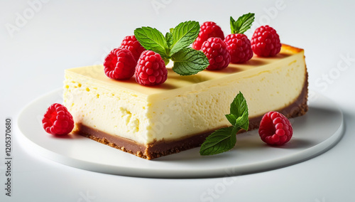 Slice of Cheesecake with Raspberries on a White Plate