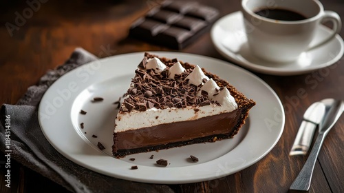 Slice of Chocolate Pie with Creamy Filling and Topped with Chocolate Shavings Next to Coffee Cup