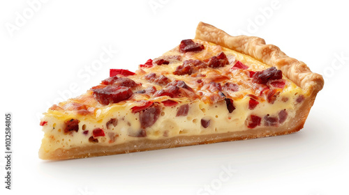 Slice of Quiche Lorraine on a white background, featuring crèe fraïche, fresh herbs, and truffle-infused potato chips for an elegant presentation.