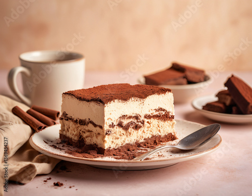 slice of tiramisu dusted with cocoa on plain pastel cream background decadent and artistic