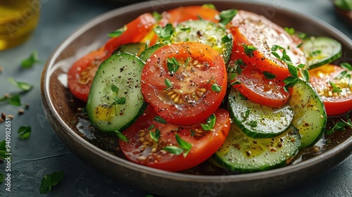 Sliced cucumber and tomato salad with olive oil