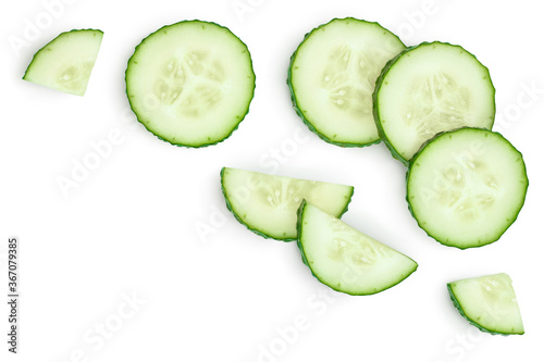 Sliced cucumber isolated on white background with clipping path and full depth of field, Top view with copy space for your text. Flat lay