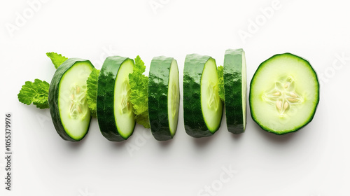 Sliced cucumber with fresh mint leaves on a white background, showcasing fresh and healthy ingredients for cooking or garnish.