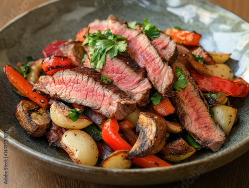 Sliced Grilled Steak with Roasted Vegetables in a Bowl Close Up Delicious Meal Presentation