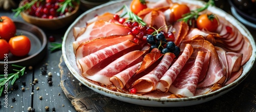 Sliced ham on white plate with berries and tomatoes