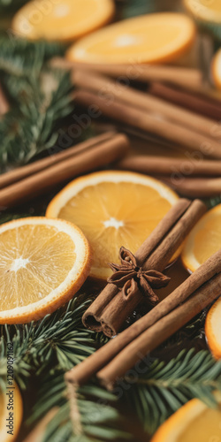 Sliced oranges with cinnamon sticks and pine branches for a festive aromatic display