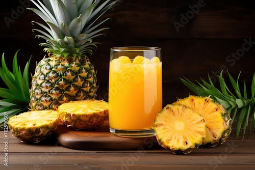 Sliced pineapples and glass of juice on wooden background