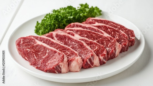 Sliced raw steak arranged on a clean white plate with fresh green parsley, shot from an overhead angle on a light textured background.